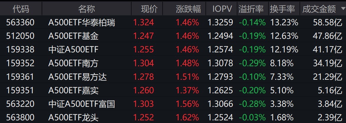 截至上午收盘,场内跟踪中证A500指数的ETF涨超1%。其中,有8只中证A500相关ETF成交额超1亿元,2只超47亿元。A500ETF华泰柏瑞、A500ETF基金早盘成交额分别为58.58亿元、47.86亿元。
