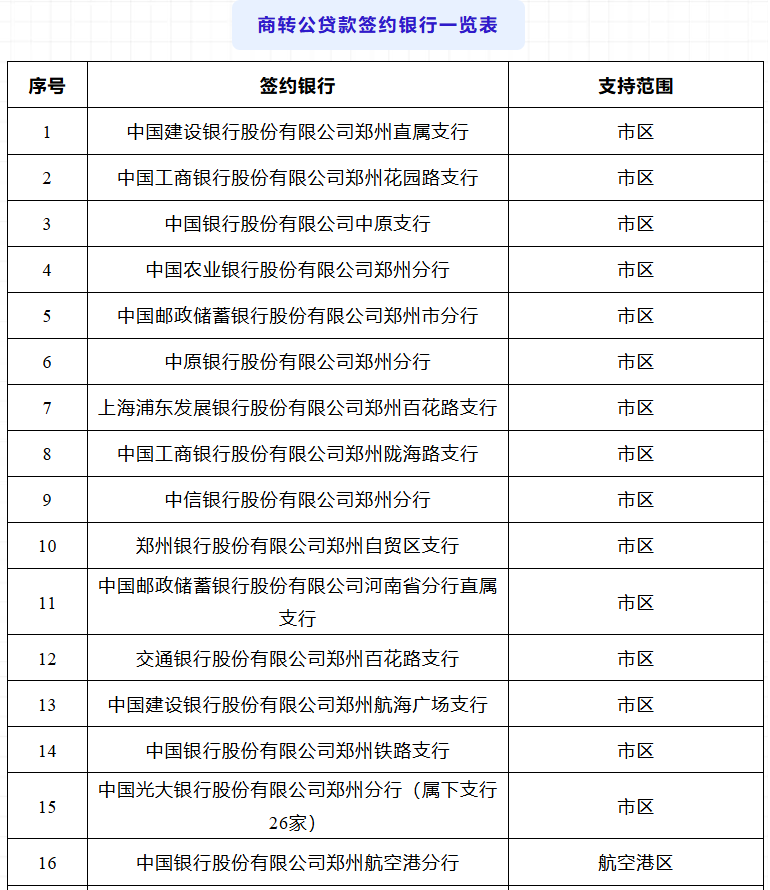 此前,郑州已有63家银行签约商转公贷款协议,加上此次公布的银行,目前一共有64家银行可办理商转公贷款业务。