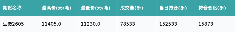 南财智讯2月24日电,盘后期货数据显示,大连商品交易所的生猪主力合约收跌2.21%,收盘报11265.0元/吨,日内资金流入4.69亿元。其他相关指标见下表: