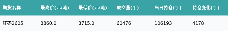 南财智讯2月24日电,盘后期货数据显示,郑州商品交易所的红枣主力合约收涨0.23%,收盘报8845.0元/吨,日内资金流入4434.53万元。其他相关指标见下表: