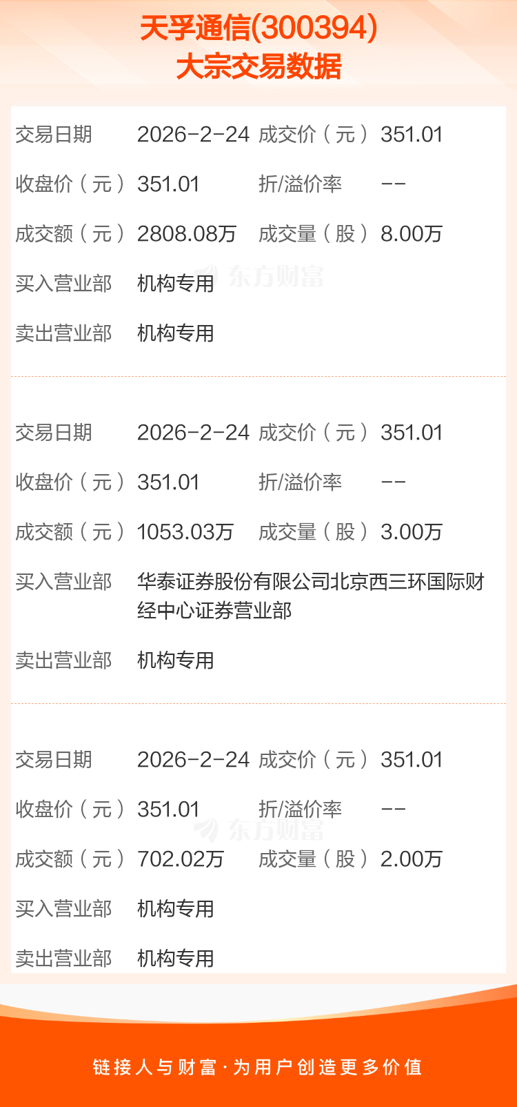 2026年2月24日,天孚通信发生3笔大宗交易,共成交13.00万股,成交金额4563.13万元,占其流通市值比例为0.02%。