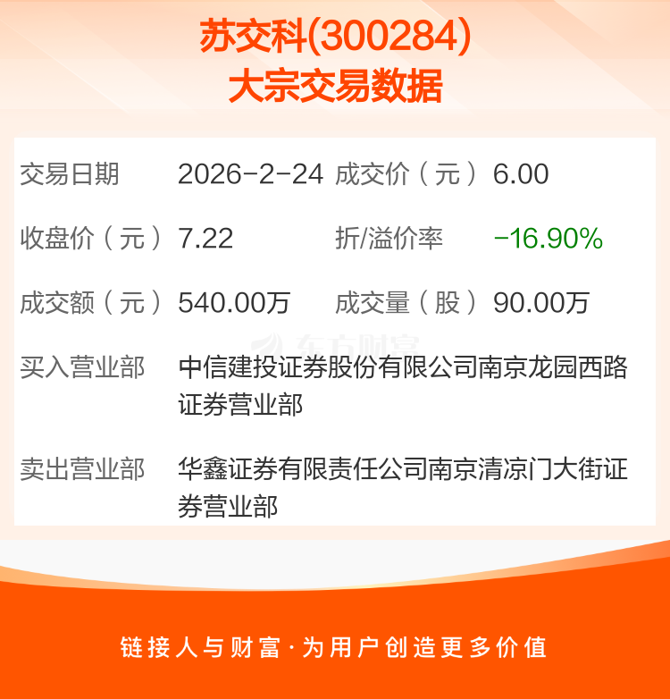 2026年2月24日,苏交科发生1笔大宗交易,共成交90.00万股,成交金额540.00万元,占其流通市值比例为0.06%。