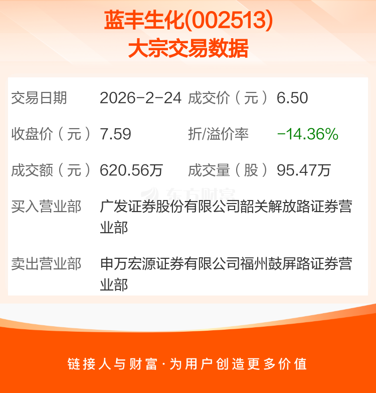 2026年2月24日,蓝丰生化发生1笔大宗交易,共成交95.47万股,成交金额620.56万元,占其流通市值比例为0.28%。