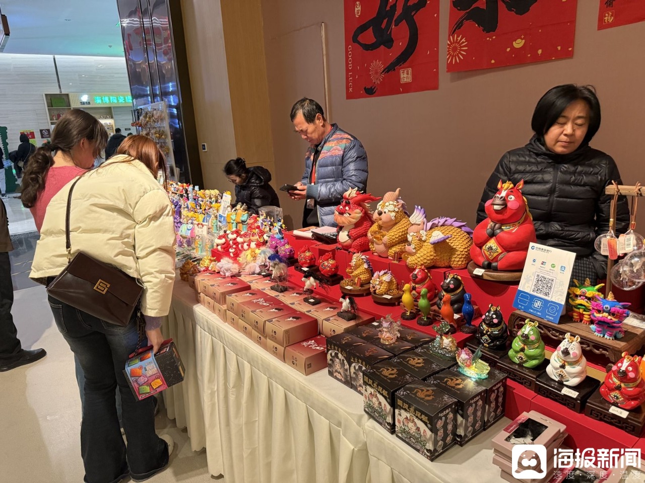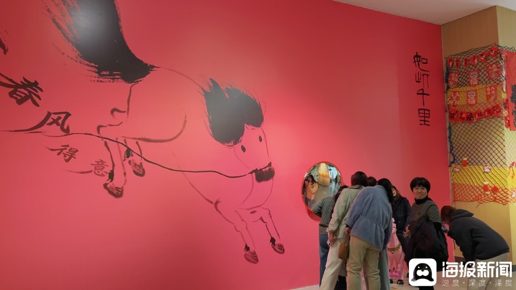 人气高涨的背后,是博物馆对文旅融合的深度探索。馆内设置文创市集、陶艺工坊体验区、非遗拓印互动区,让游客从“旁观者”变为“参与者”。“齐骥迎春”现场特别设置了“万马奔腾”“2026你我皆黑马”“如此千里”及“祈福许愿墙”等多处创意互动打卡场景。游客可以在此拍照留念、许下新年愿望,亲身融入这场艺术盛宴,感受传统工艺与当代生活的趣味连接。