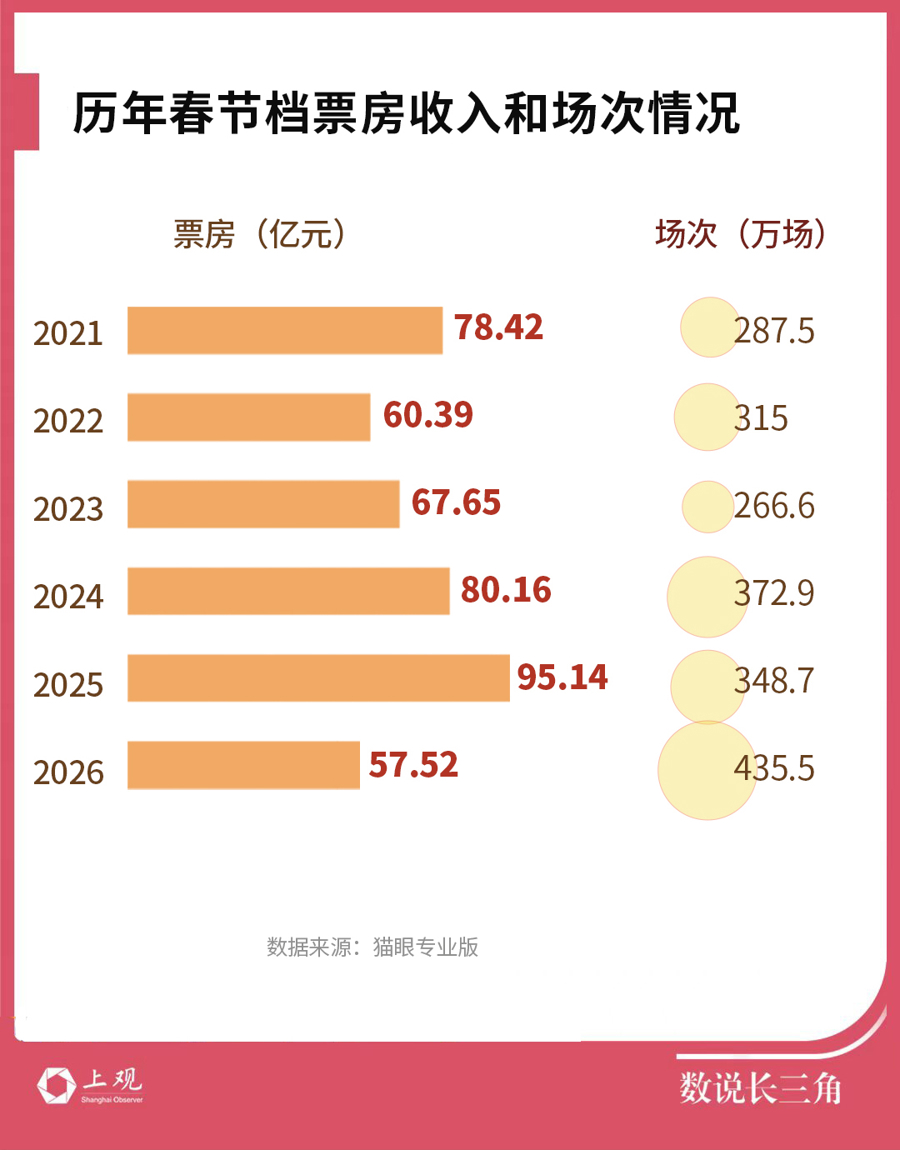 今年春节档,根据国家电影局和猫眼专业版的数据,从场次上看,春节档场次已达435.5万场,较去年348.7万场有大幅提升,刷新了中国影史春节档总场次纪录。