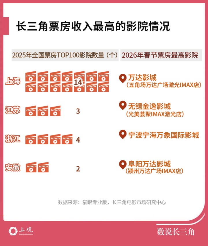 一是影院基础设施高度密集。截至2025年底,江苏全省共有影院1305家、银幕8167块;截至去年6月,上海全市16个区共有358家影院、2217块银幕,规模体量居全球城市首位。在数量庞大之余,头部影院的密集也带来了更大的市场增量。在2025年影院票房收入全国前100影院中,上海以一城之力拥有14家,长三角三省一市共拥有23家,约占四分之一。