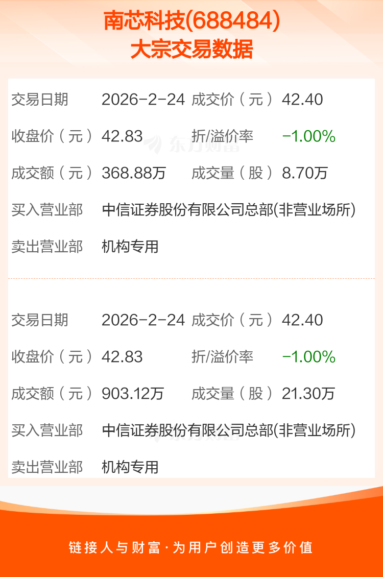 2026年2月24日,南芯科技发生2笔大宗交易,共成交30.00万股,成交金额1272.00万元,占其流通市值比例为0.10%。