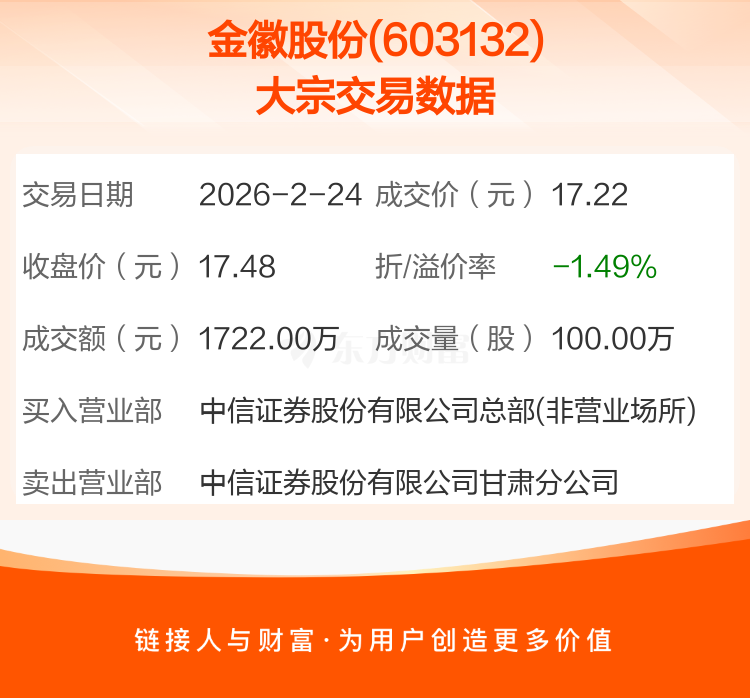 2026年2月24日,金徽股份发生1笔大宗交易,共成交100.00万股,成交金额1722.00万元,占其流通市值比例为0.10%。