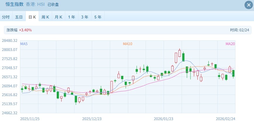 今日(2月24日),港股市场震荡走弱,主要股指全线收跌,受隔夜美股回调拖累,开盘后持续下探,全天呈现单边下行态势,市场情绪趋于谨慎,板块分化显著。