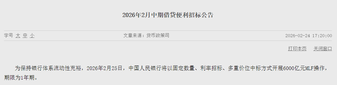 【大河财立方消息】2月24日,央行公告,为保持银行体系流动性充裕,2026年2月25日,中国人民银行将以固定数量、利率招标、多重价位中标方式开展6000亿元MLF操作,期限为1年期。