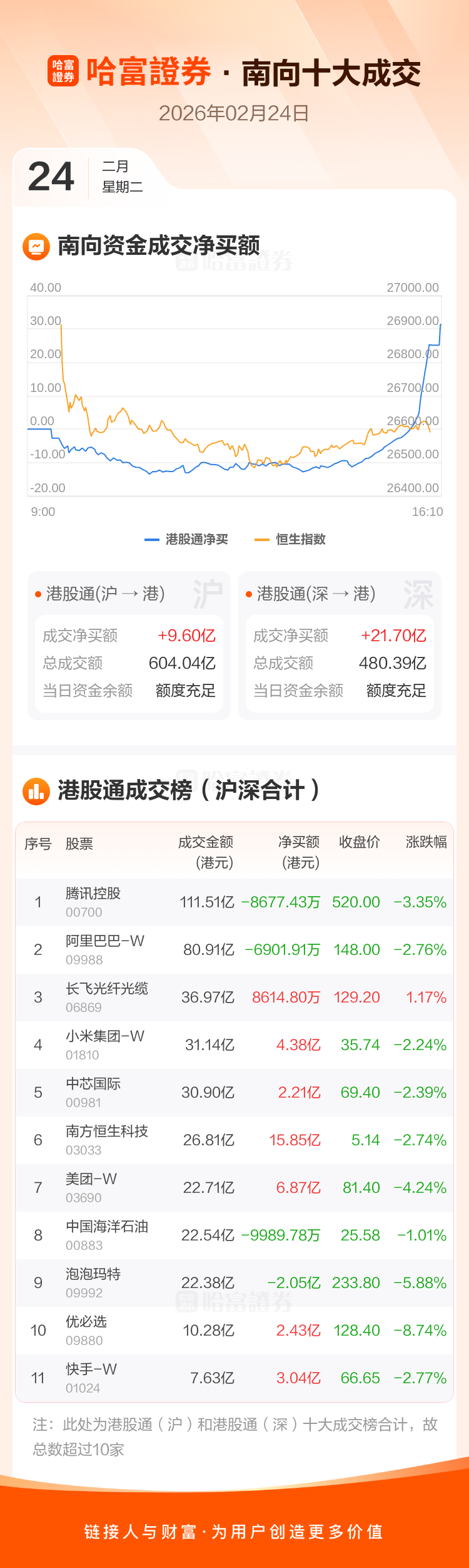 恒生指数2月24日跌1.82%,收报26590.32点。南向资金今日净买入港股31.31亿港元。南向资金今日成交额1084.43亿港元,港股大市成交2509.92亿港元。