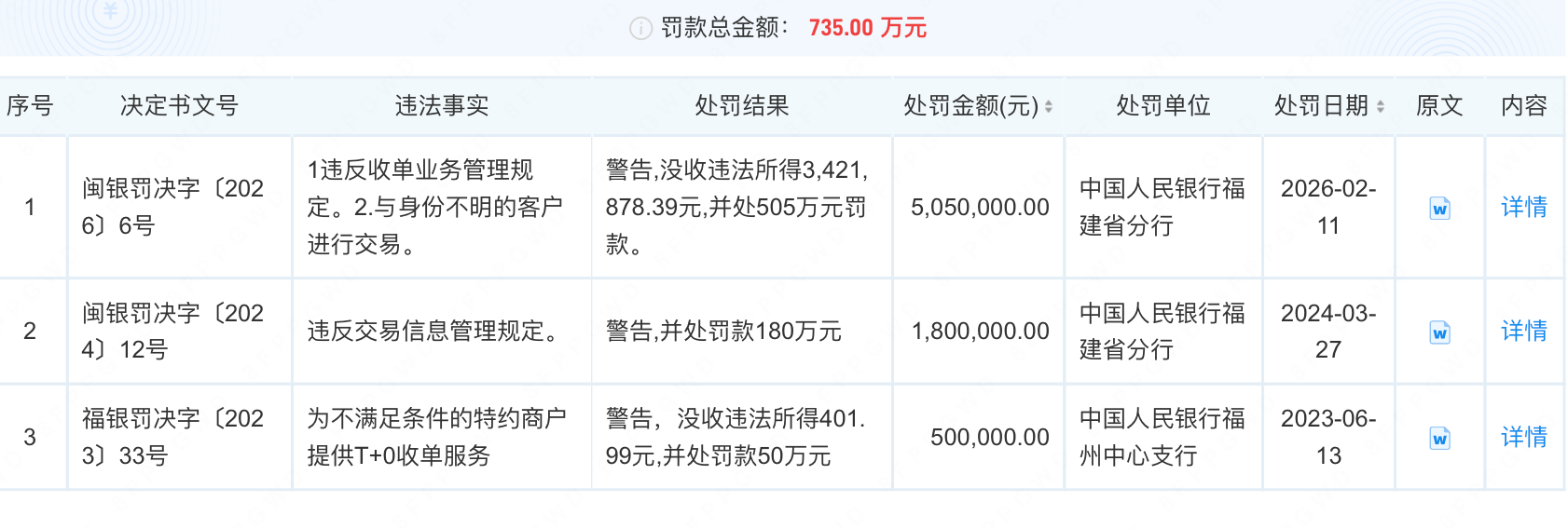上证报中国证券网讯(记者徐潇潇)记者2月24日了解到,中国人民银行福建省分行近日作出处罚,福建星驿支付科技有限公司(下称“星驿支付”)因违反收单业务管理规定、与身份不明的客户进行交易,被警告、没收违法所得约342.19万元、并处505万元罚款;该公司相关责任人林某因对上述违法行为负有责任,被警告并处罚款19万元,此次处罚公示期限均为五年。