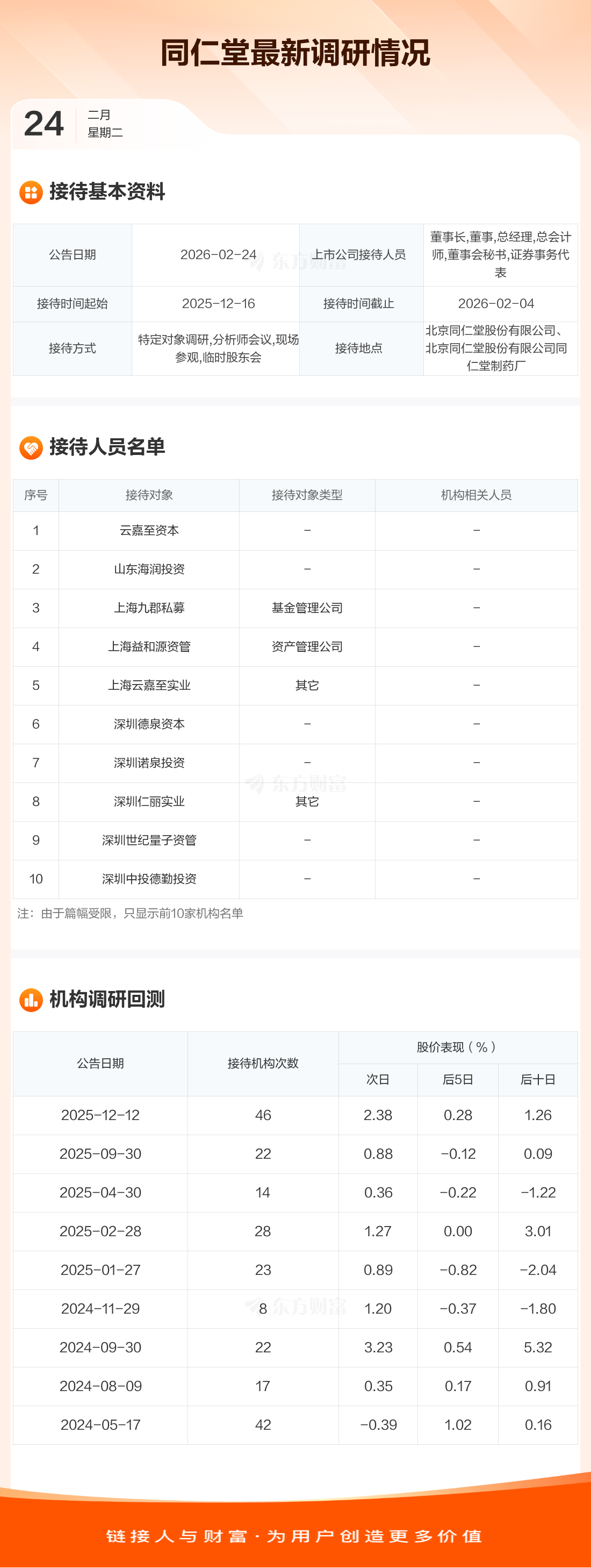 同仁堂2月24日公告称,12月16日至2月4日接待云嘉至资本等22家机构调研。接待人员包括董事长,董事,总经理,总会计师,董事会秘书,证券事务代表。