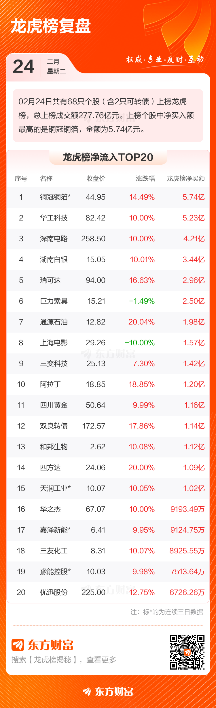2月24日共有68只个股(含2只可转债)上榜龙虎榜,总上榜成交额277.76亿元。上榜个股中净买入额最高的是铜冠铜箔,金额为5.74亿元。