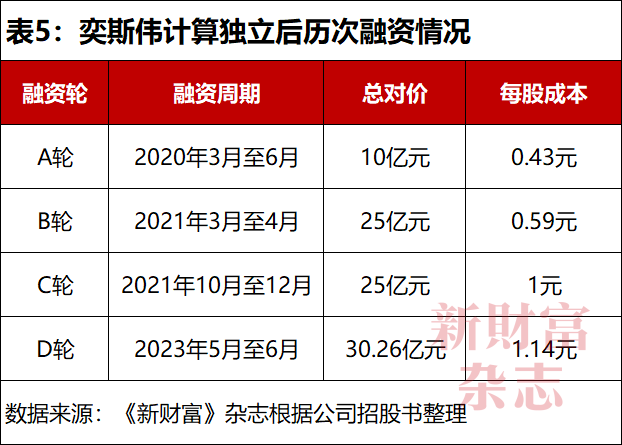 其中,奕斯伟计算在2020年融资10亿元;2021年先后融资两轮,金额合计50亿元。2022年6月,奕斯伟计算完成股改。2023年上半年,其完成最后一轮融资,金额超过30亿元,为历次融资最高(表5)。