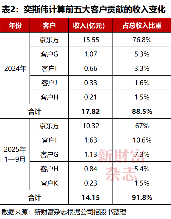 奕斯伟计算的客户主要是智能物联网企业、消费电子产品公司、科技公司以及经销商,最大客户京东方贡献的收入占比长期超过70%。2022年至2024年,奕斯伟计算来自京东方的收入为分别为15.78亿元、14.38亿元、15.55亿元,三年合计45.7亿元,占同期总营收(57.8亿元)的比重为79%。