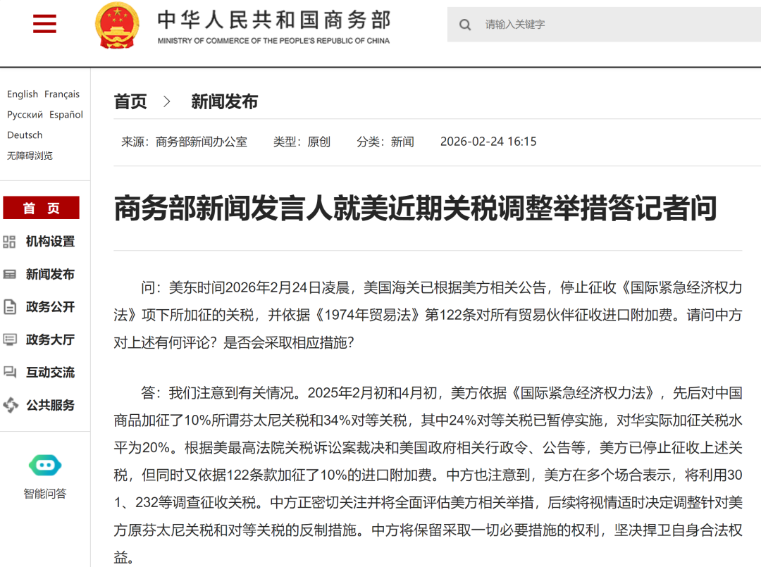 问:美东时间2026年2月24日凌晨,美国海关已根据美方相关公告,停止征收《国际紧急经济权力法》项下所加征的关税,并依据《1974年贸易法》第122条对所有贸易伙伴征收进口附加费。请问中方对上述有何评论?是否会采取相应措施?