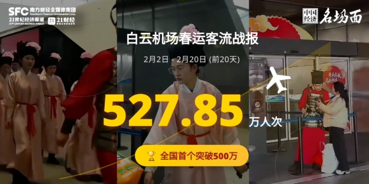 人流爆!2026年春运以来,广东跨区域人员流动量累计已超5.5亿人次。全省铁路旅客发送量刷新春运历史单日纪录。港珠澳大桥单日车流量创2.95万车次历史新高。白云机场成为全国首个春运客流量突破500万的机场。外国人也来广东过大年,春节期间,广东省入境游订单同比增长40%,深圳拿下外国游客票选“广东年味目的地”第一。