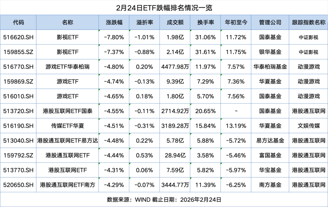 跌幅方面,有495只ETF下跌,多只影视ETF、港股通互联网ETF、游戏ETF跌幅居前。