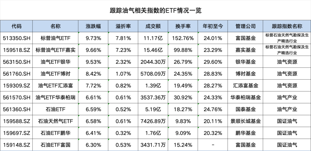 从今日涨跌幅看,跟踪标普石油天然气指数的2只ETF表现领先。其中,富国基金旗下的标普油气ETF(513350)涨幅高达9.73%,换手率高达152.76%,溢价率达7.81%,嘉实基金旗下的标普油气ETF(159518)涨幅高达9.66%,溢价率达7.23%,换手率接近100%。