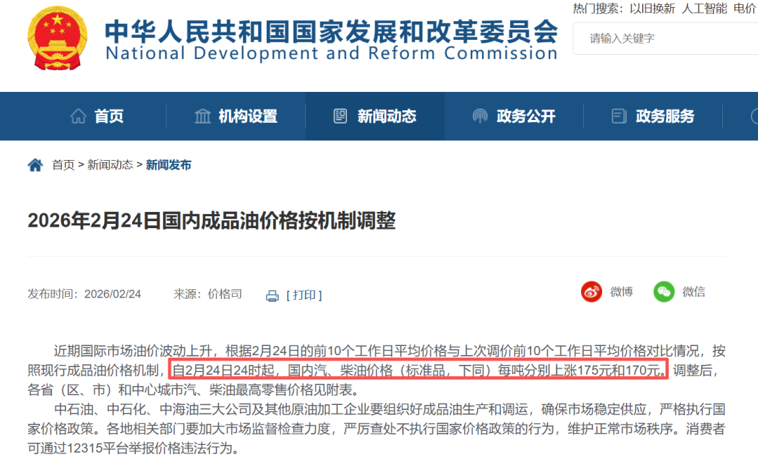 2月24日,国家发展改革委官网发布消息称,根据2月24日的前10个工作日平均价格与上次调价前10个工作日平均价格对比情况,按照现行成品油价格形成机制,自2月24日24时起,国内汽、柴油价格每吨分别上涨175元和170元。