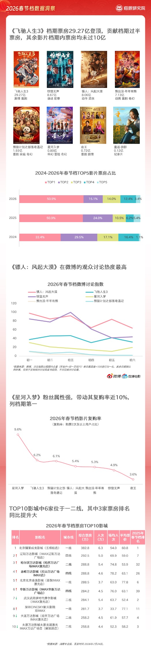 可以说,2026年春节档呈现的是许多方面的下猫眼娱乐市场分析师赖力表示,由于缺乏强流量高热度的爆款大片的带动,档期内整体表现平平,最终呈现“冰火两重天”的格局。虽然仅有初一当天单日票房过10亿元,但整体仍保持住了较为稳定的跌幅。同时,今年春节档在下沉市场,以及影院终端放映能力提升等方面依旧有不错的表现。