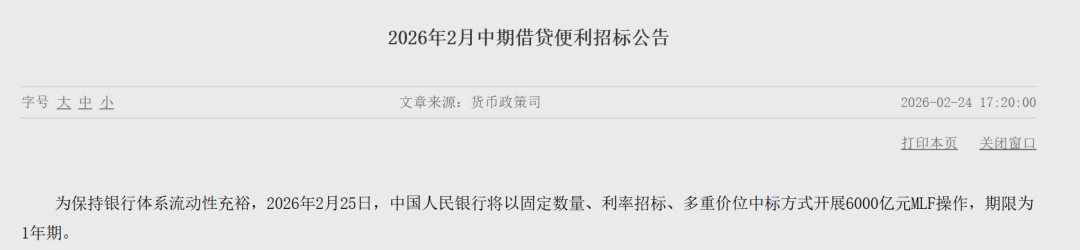 中国人民银行网站2月24日消息,为保持银行体系流动性充裕,2月25日,中国人民银行将以固定数量、利率招标、多重价位中标方式开展6000亿元MLF(中期借贷便利)操作,期限为1年期。