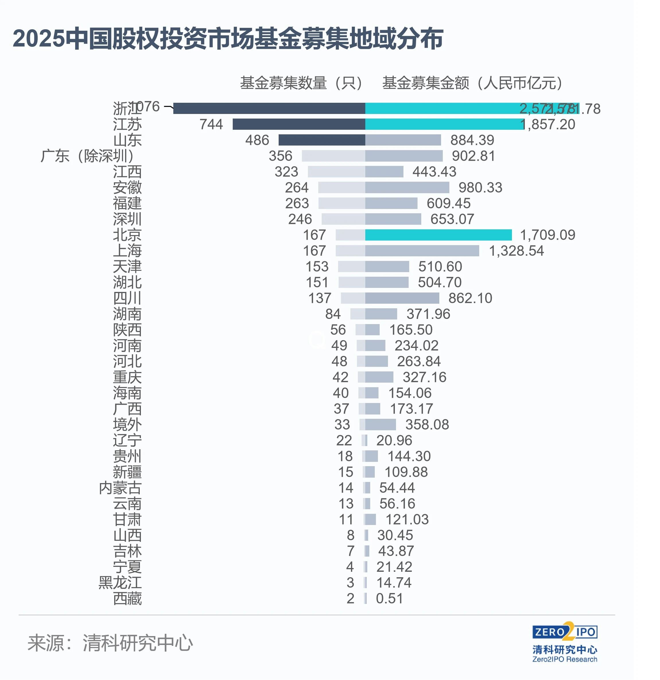 2025年,浙江新募集基金数量及规模均居于首位,共有1076只基金完成新一轮募集,同比上升41.8%;募集规模达到2571.78亿元人民币,同比上升40.8%。其中,两笔浙江省社保科创基金子基金落地,金额分别为80.82亿元和60.62亿元,位居浙江省募资规模前列。