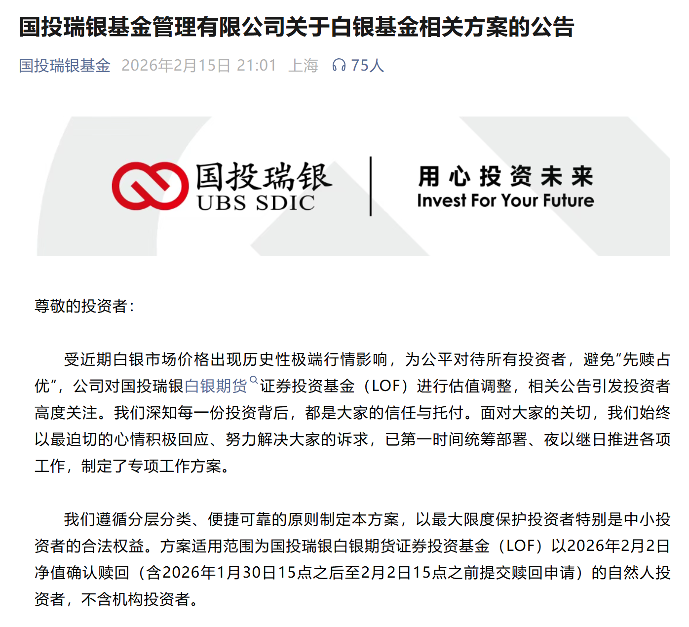 国投瑞银基金表示,投资者可通过支付宝搜索“国投瑞银白银基金”小程序,按提示完成身份核验后在线办理相关事宜。因涉及投资者人数众多,相关小程序将于2026年2月26日正式启用。