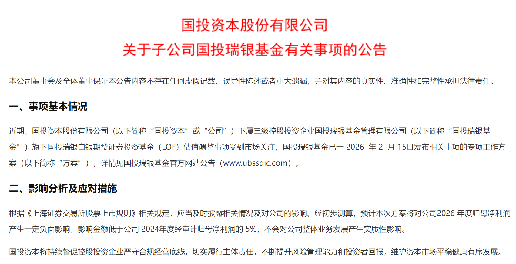 同日晚间,国投资本发布公告,首次就国投白银LOF估值调整引发的补偿方案作出正式回应。国投瑞银基金是国投资本下属三级控股投资企业。