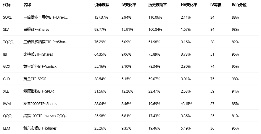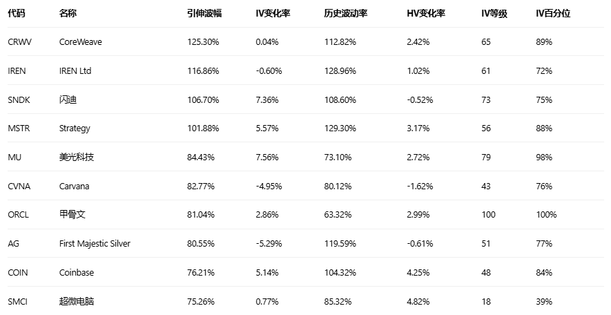 引申波幅排行榜(标的市值>10亿美元,且期权成交量>10万)