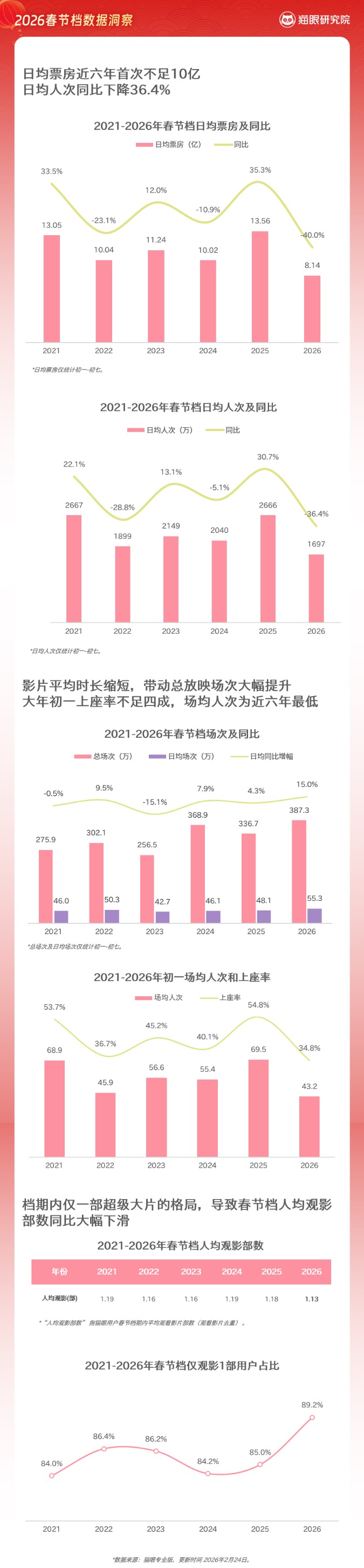 今年春节档多人观影比例维持高位,家庭观影属性仍较强,中高频观众占比创新高,同时也说明影片破圈有限。在《飞驰人生3》和《镖人》的带动下,今年春节档购票画像首次更偏向年长男性,但平均购票年龄同比略偏年轻。猫眼娱乐市场分析师赖力表示,今年春节档虽然仅有初一当天单日票房过10亿元,但整体仍保持住了较为稳定的跌幅。同时,今年春节档在下沉市场,以及影院终端放映能力提升等方面依旧有不错的表现。