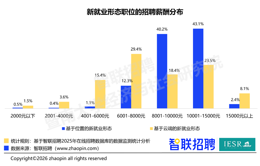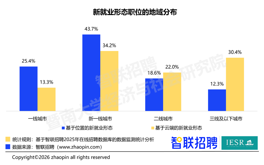 该报告由暨南大学经济与社会研究院联合智联招聘发布,首次系统将新就业形态划分为“基于位置”和“基于云端”两大类型。数据显示,2025年基于位置的新就业形态(如网约车、配送、生活服务)招聘职位高度集中于一线和新一线城市,合计占比达69.1%;而基于云端的岗位(如知识服务、新媒体、电商)则加速向三四线城市下沉,三线及以下城市招聘占比达30.4%。