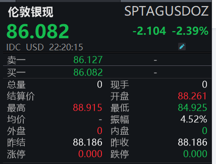 现货白银日内跌超2%,截至发稿,报86.082美元/盎司。