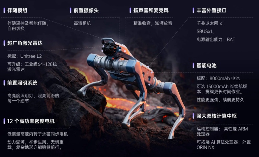 Unitree As2采用IP54防雨水设计,可在复杂天气和环境中稳定工作;仿生具身大模型,实现奔跑、攀爬、跳跃等多种灵敏动作,最大空载速度达5m/s,具备攀越50厘米垂直高台及40°斜坡的能力;配备8核高性能CPU,升级ISS 3.0智能伴随系统,实现厘米级高精度定位与稳定伴随/跟随;提供友好的二次开发接口,支持搭载AI大模型,实现具身智能交互与自主决策。