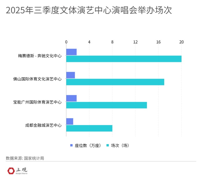 答案也是上海。2025年第三季度,梅赛德斯-奔驰文化中心以20场演出领跑全国同类场馆。这意味这座1.8万人的场馆几乎每周都有灯光亮起,平均每4.5天就有一场演唱会上演。