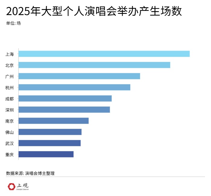 根据微博“演唱会博主”收集整理显示,2025年体育馆级别及以上的个人演唱会(不包括拼盘演唱会),上海以193场的数量遥遥领先,北京和广州分列第二第三。