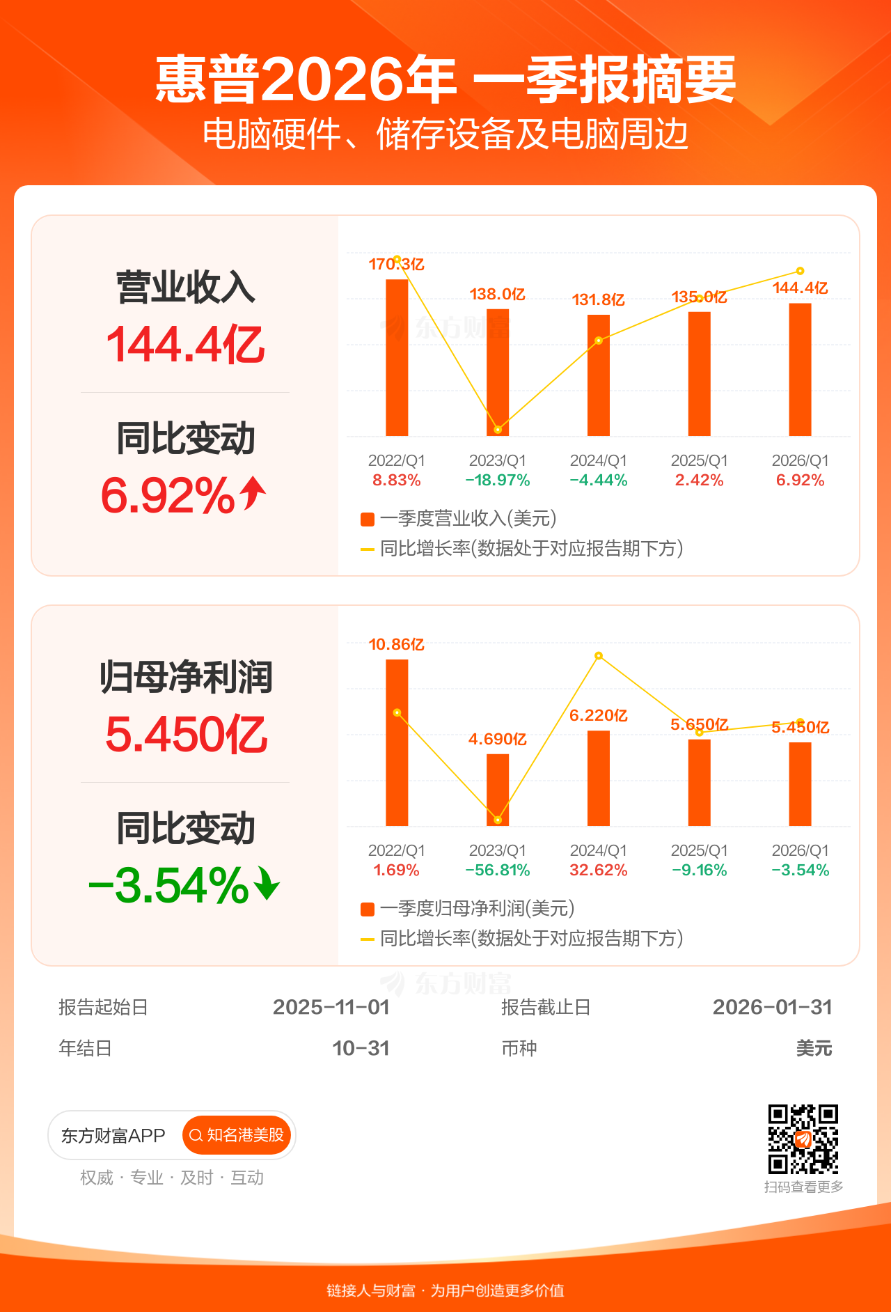 惠普2月24日发布一季报业绩,截至2026年1月31日的3个月内,该公司营业收入144.38亿美元,同比增长6.92%;公司权益持有人应占溢利(归母净利润)5.45亿美元,同比减少3.54%。