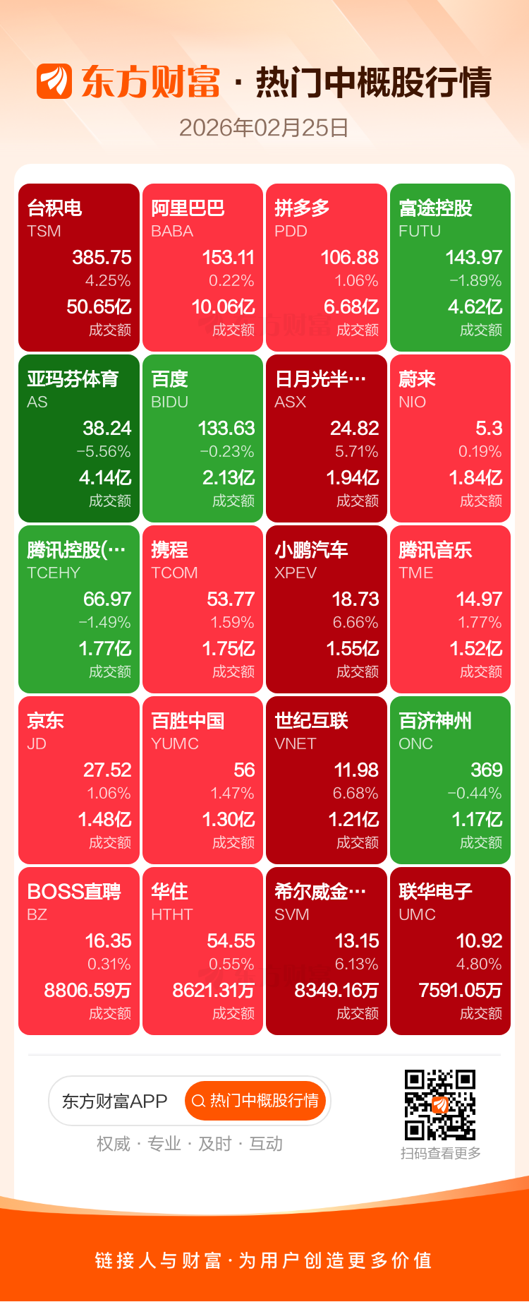 台积电涨4.25%,阿里巴巴涨0.22%,拼多多涨1.06%,富途控股跌1.89%,亚玛芬体育跌5.56%,百度跌0.23%,日月光半导体涨5.71%,蔚来涨0.19%,腾讯控股(ADR)跌1.49%,携程涨1.59%。