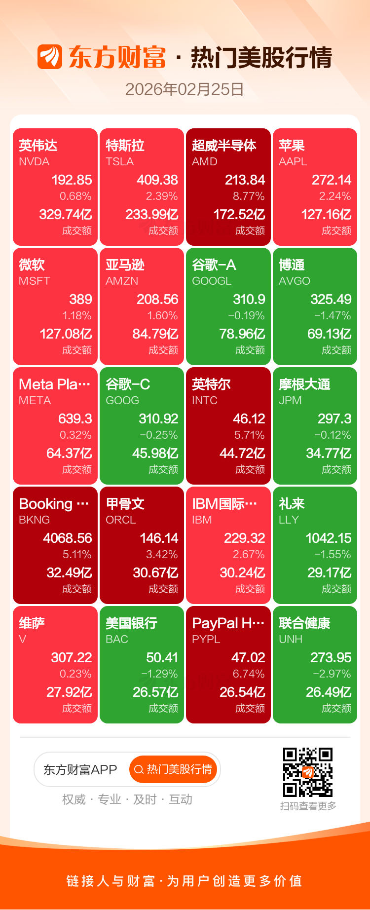英伟达涨0.68%,特斯拉涨2.39%,超威半导体涨8.77%,苹果涨2.24%,微软涨1.18%,亚马逊涨1.60%,谷歌-A跌0.19%,博通跌1.47%,Meta Platforms Inc-A涨0.32%,谷歌-C跌0.25%。