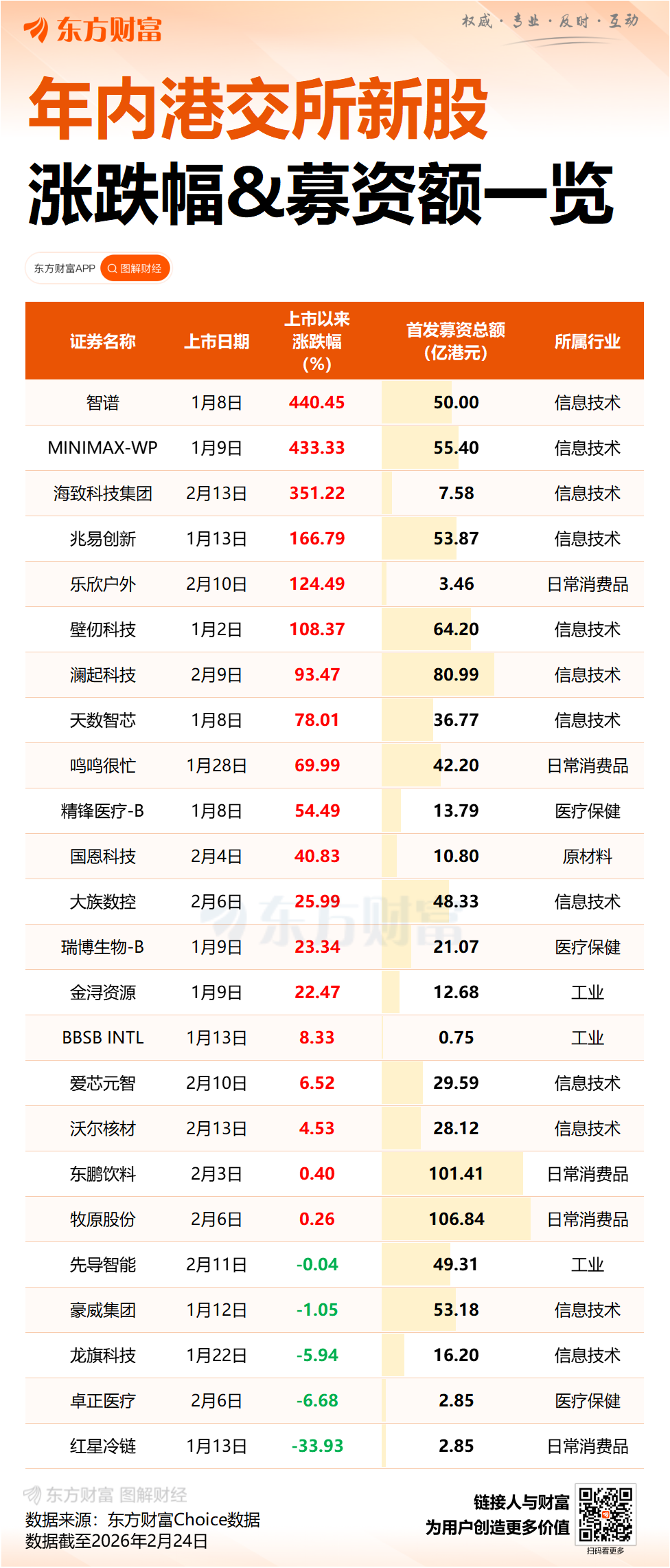在开年以来募资额靠前的IPO项目中,牧原股份、东鹏饮料等消费龙头虽稳居前列,但更引发市场热议的,则是AI赛道掀起的资本热潮。壁仞科技、智谱、MINIMAX等AI企业相继完成上市,单笔募资均超50亿港元,首日涨幅更是全线突破50%,成为开年IPO阵营中最吸睛的力量。
