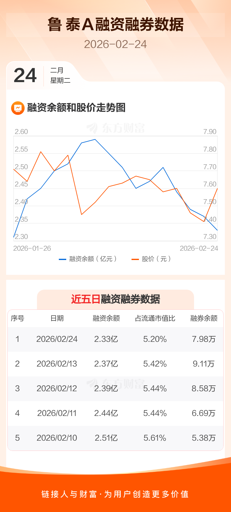 交易所最新数据显示,鲁 泰A于2026年2月24日获融资买入853.79万元,融资偿还1243.48万元,当日融资净偿还389.69万元。目前,该股融资余额2.33亿,占流通市值比例为5.20%。