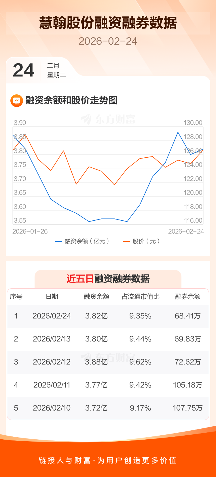 交易所最新数据显示,慧翰股份于2026年2月24日获融资买入1060.71万元,融资偿还821.39万元,当日融资净买入239.32万元。目前,该股融资余额3.82亿,占流通市值比例为9.35%。