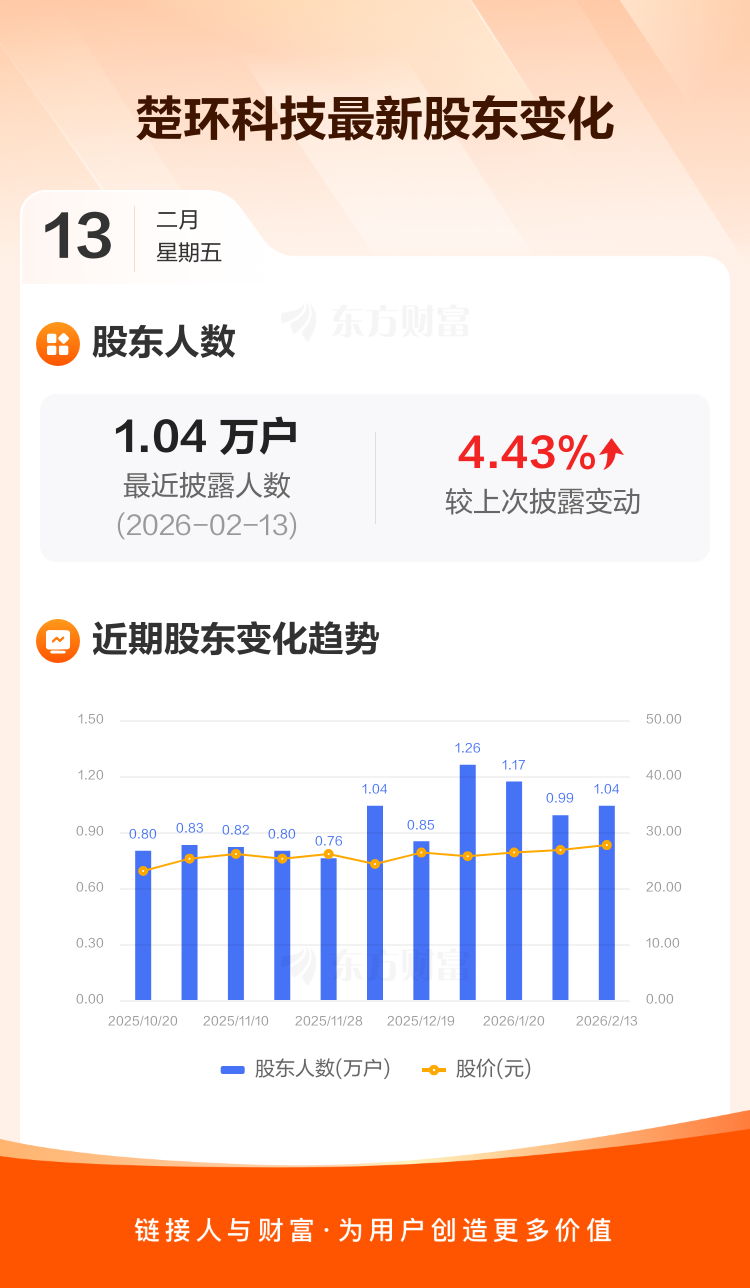 楚环科技最新披露数据显示,截至2月13日公司股东户数为1.04万户,较上期(2026年1月30日)增加440户,增幅为4.43%。户均持有流通股数量由上期的4689股下降至4490股,户均持股金额由上期的12.56万元减少至12.42万元。