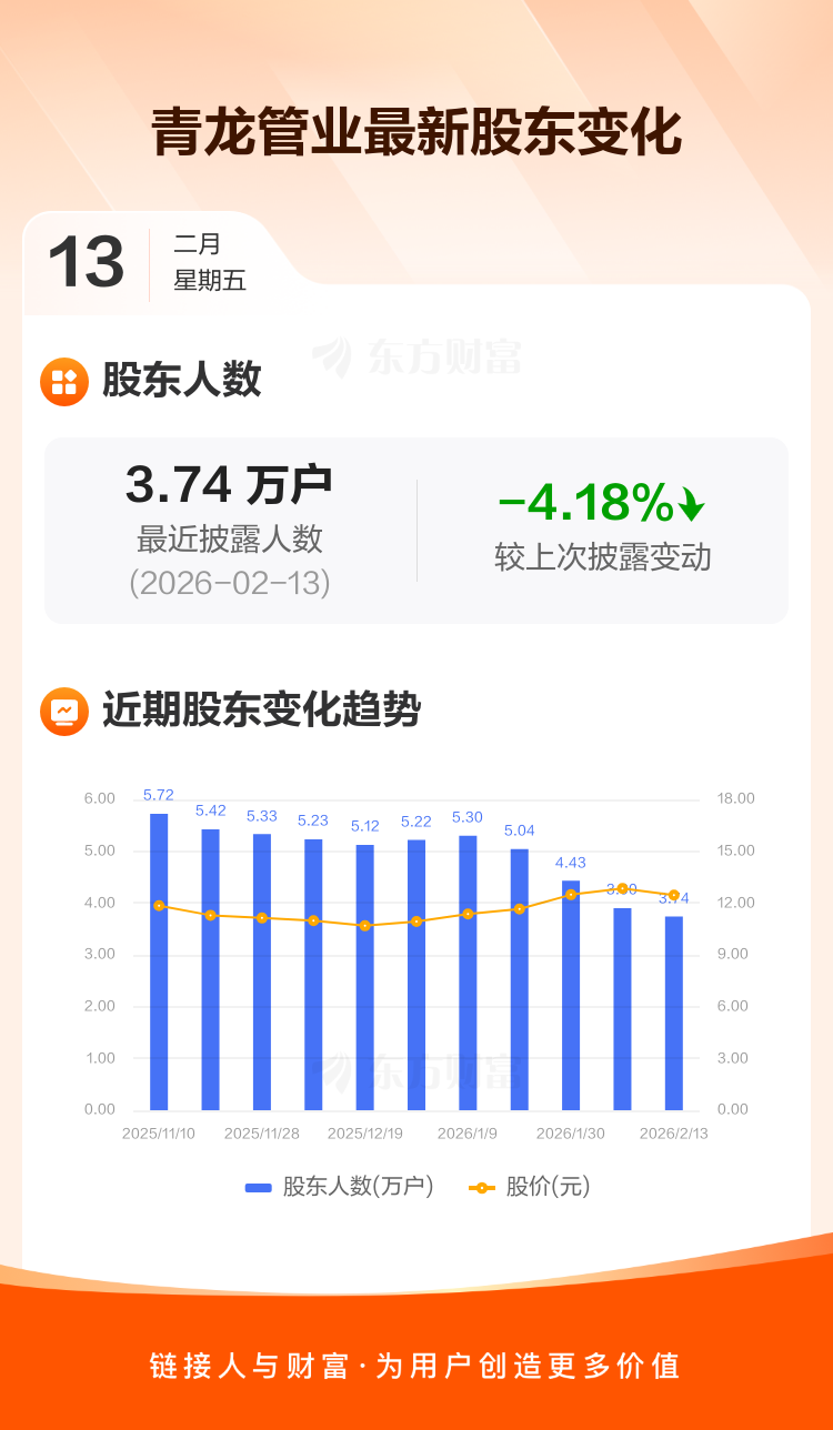青龙管业:截至2月13日最新股东户数3.74万户,较上期减少4.18%