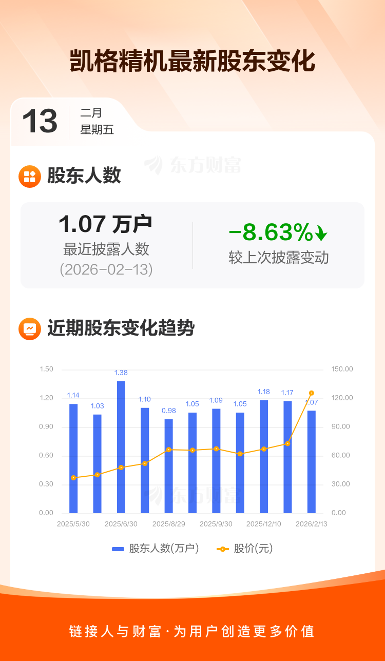 凯格精机:截至2月13日最新股东户数1.07万户,较上期减少8.63%