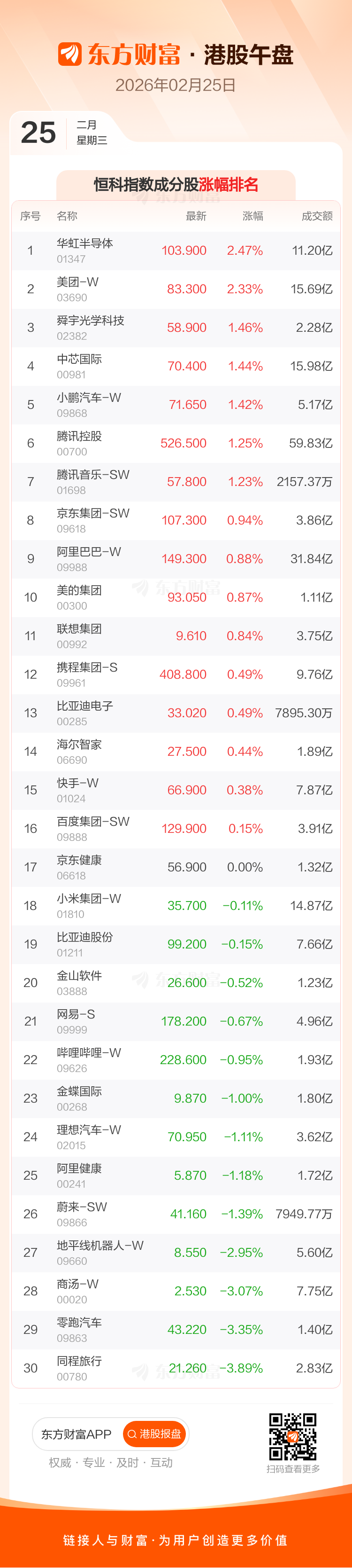 港股2月25日午盘走高,恒生指数收报26789.86点,涨199.54点,涨幅0.75%;恒生科技指数收报5288.38点,涨17.68点,涨幅0.34%。恒生指数成分股中海底捞、龙湖集团、安踏体育涨幅居前,信义光能、万洲国际、中升控股跌幅靠前。恒生科技指数成分股中华虹半导体、美团-W、舜宇光学科技涨幅居前,同程旅行、零跑汽车、商汤-W跌幅靠前。