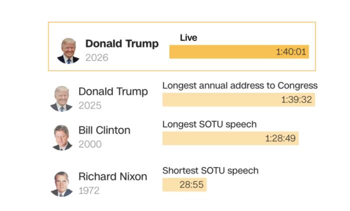 美国有线电视新闻网称,2025年,特朗普的演讲持续了1小时39分钟32秒,而今年,特朗普的演讲持续了1小时40分钟1秒。美国全国广播公司称,今年特朗普的国情咨文演讲在创纪录的1小时 47分钟后结束。