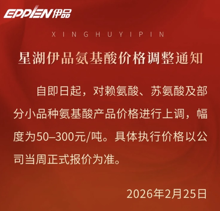 星湖科技旗下星湖伊品上调氨基酸产品价格