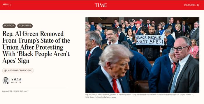 报道指出,艾尔·格林向特朗普挥舞标语,标语上写着:“黑人不是猿”。格林朝着讲台高声喊叫,一些人试图从他手中夺走牌子,但没有成功。随后,他被迅速带离场。这已经是格林连续第二年在特朗普向国会发表讲话时被驱离。